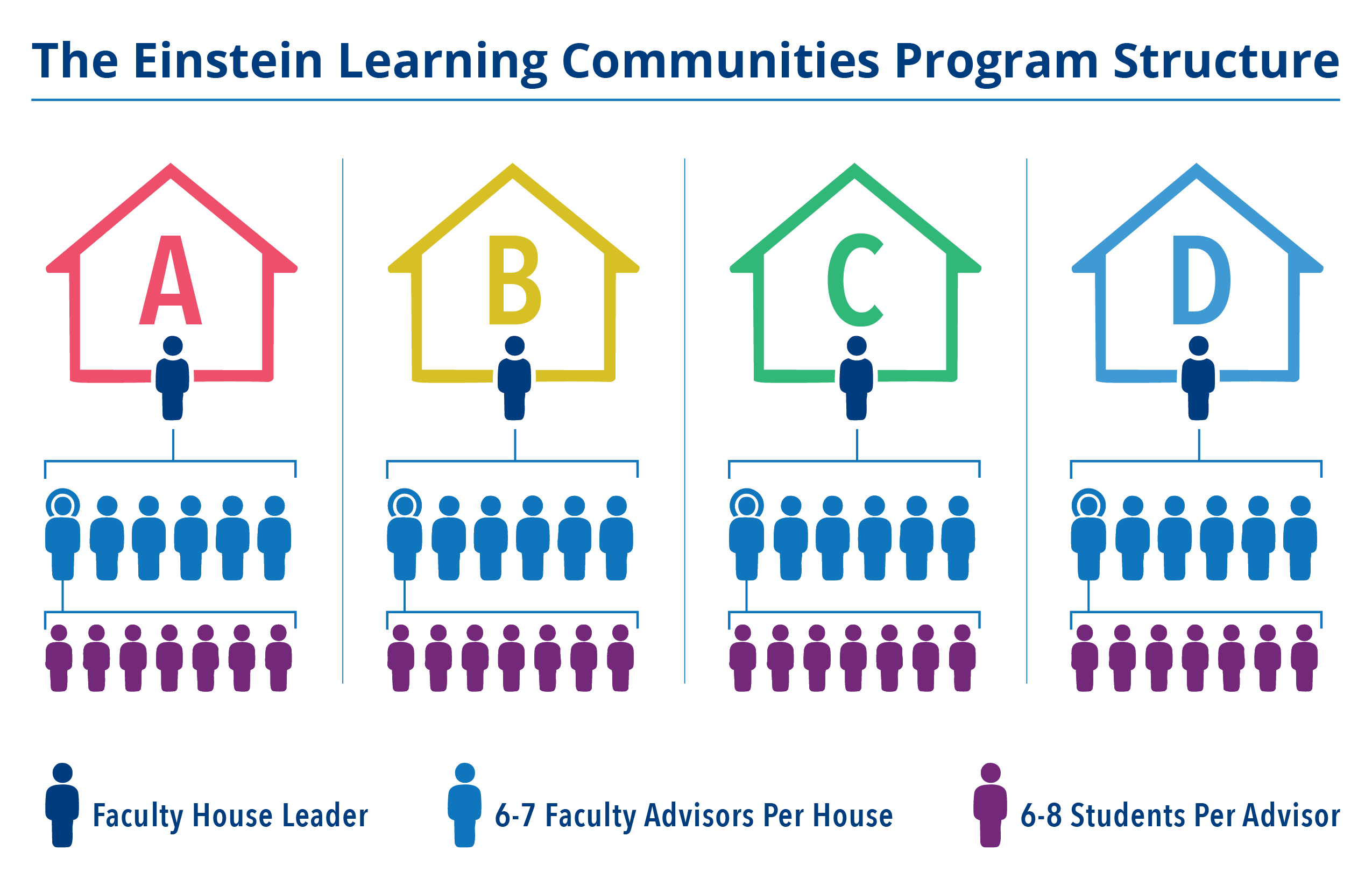 The ELCP divides each incoming first-year class into four houses—A, B, C, and D—each set up with six to seven dedicated faculty advisors, including a house leader. Each faculty advisor is assigned six to eight students, and these small groups remain together throughout the four years of medical school. The faculty advisors devote about a day and a half of their time to the ELCP each week.
